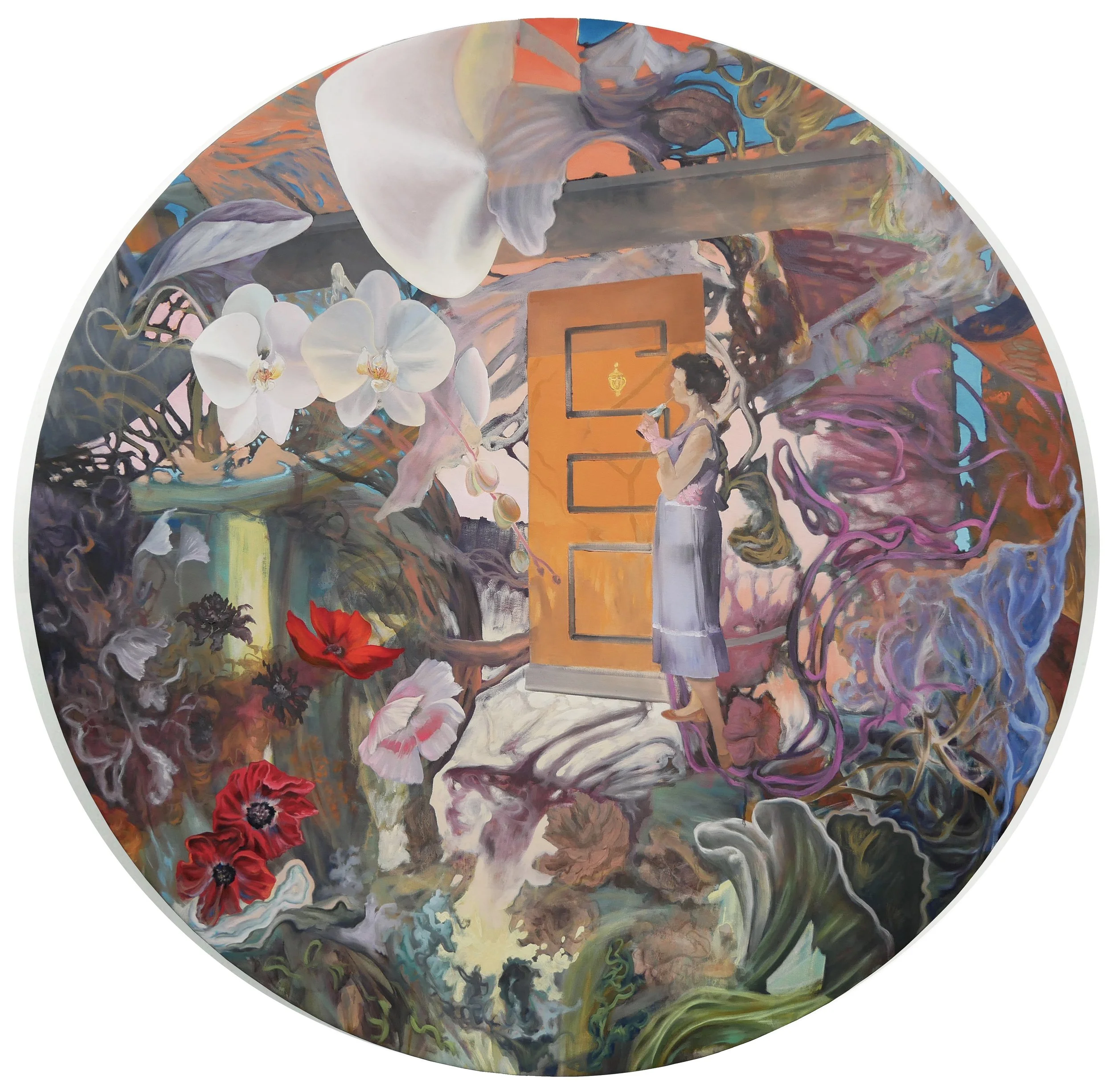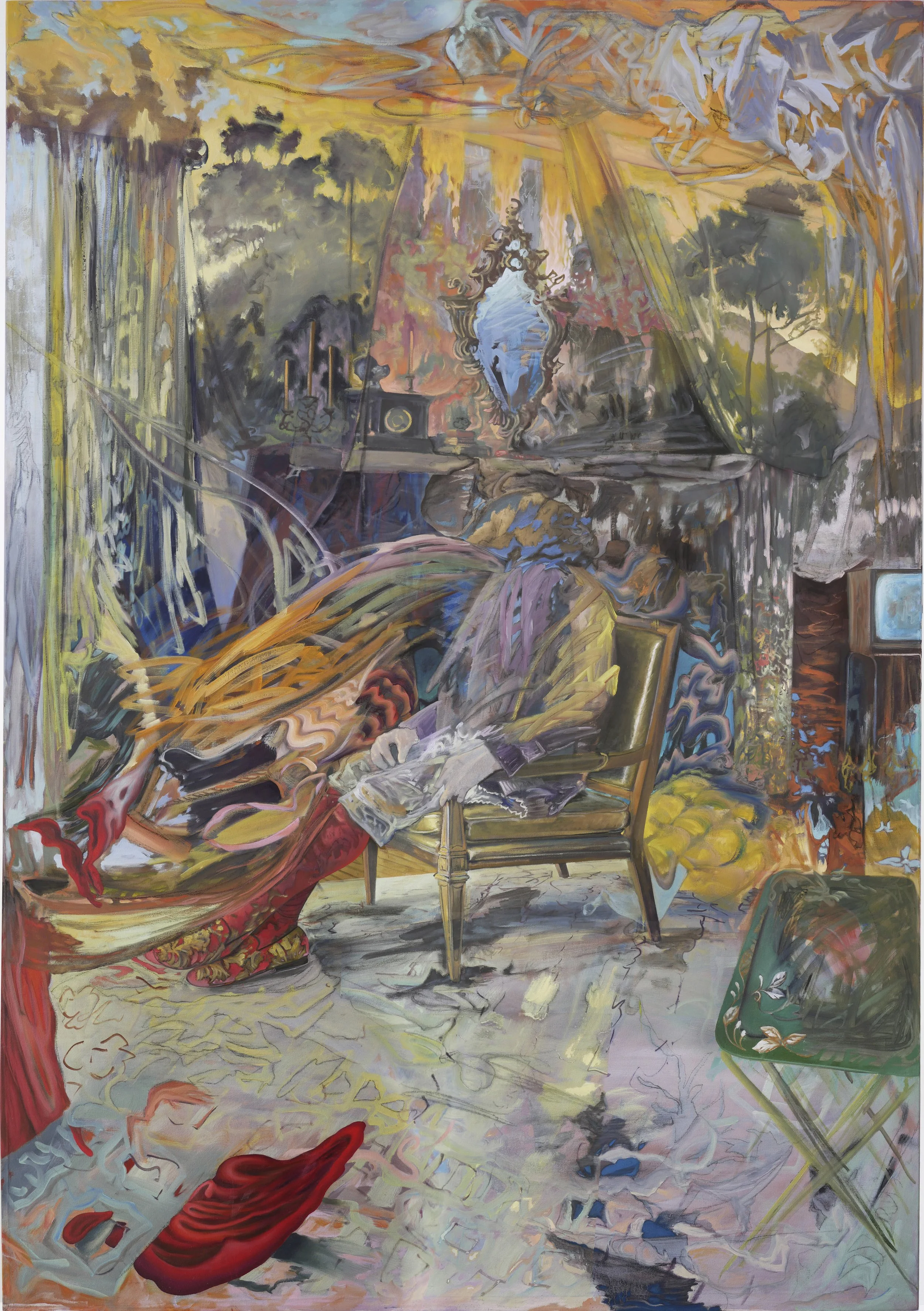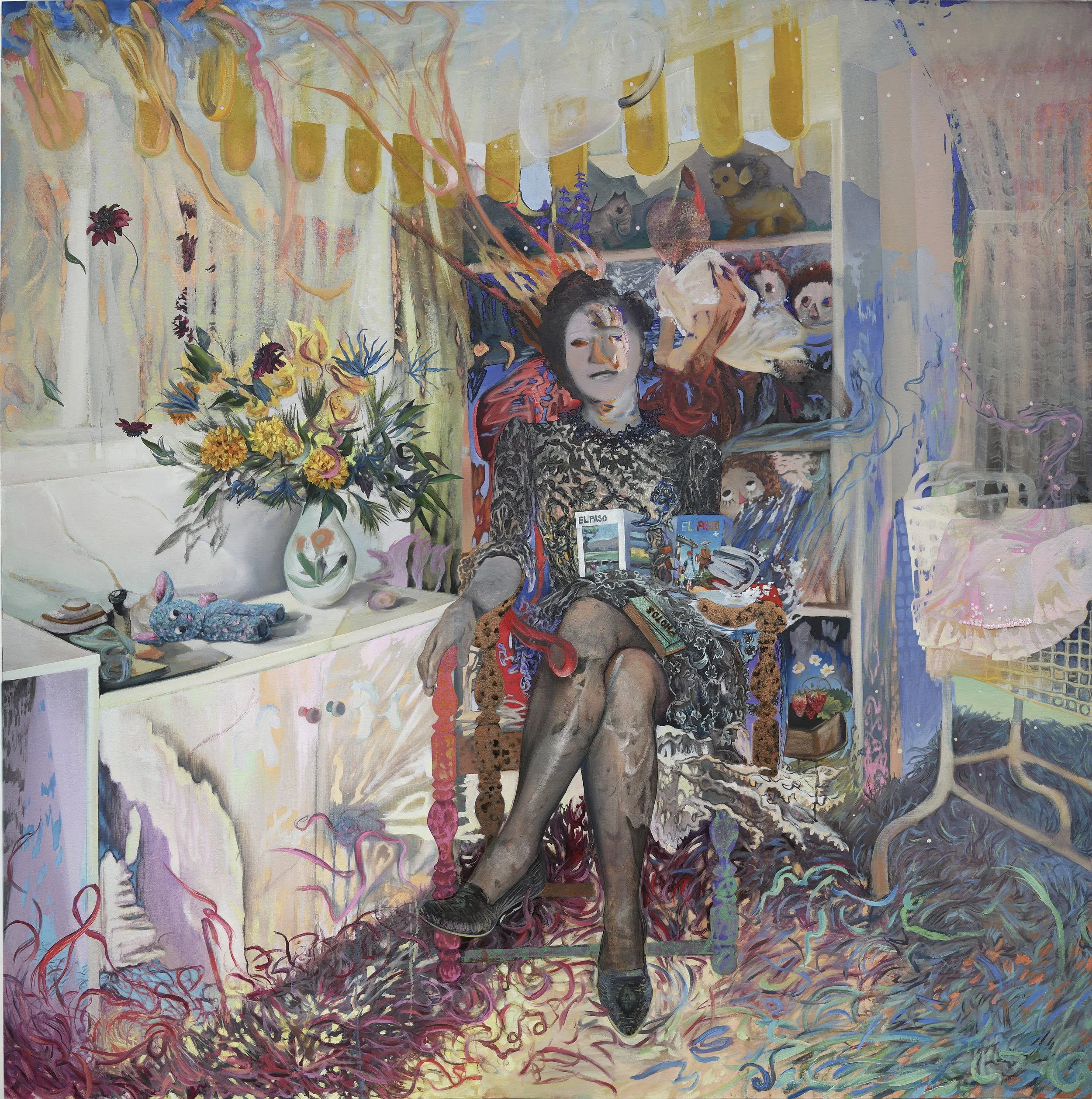 Carrillo Azevedo paints enigmatic and ethereal scenes of people and places in oil on canvas, linen, and board. Most of the paintings in this series are set in domestic spaces, as pictured in the vintage American interior design magazines that the artist collects. The paintings first appear as typical images from the ideal family: a woman wearing a blue dress in a glamorous living room in Everybody’s Mad About Pink; a child playing the piano, encouraged by an adult in The Piano Lesson; two children with his grandmother standing outside their home in Pillars of Sand. The artist’s choice of exuberant color palette and his subject matter give viewers a sense of the loving comforts of an ideal home, reminiscent of early 20th century canvases by Mary Cassatt or Berthe Morisot.