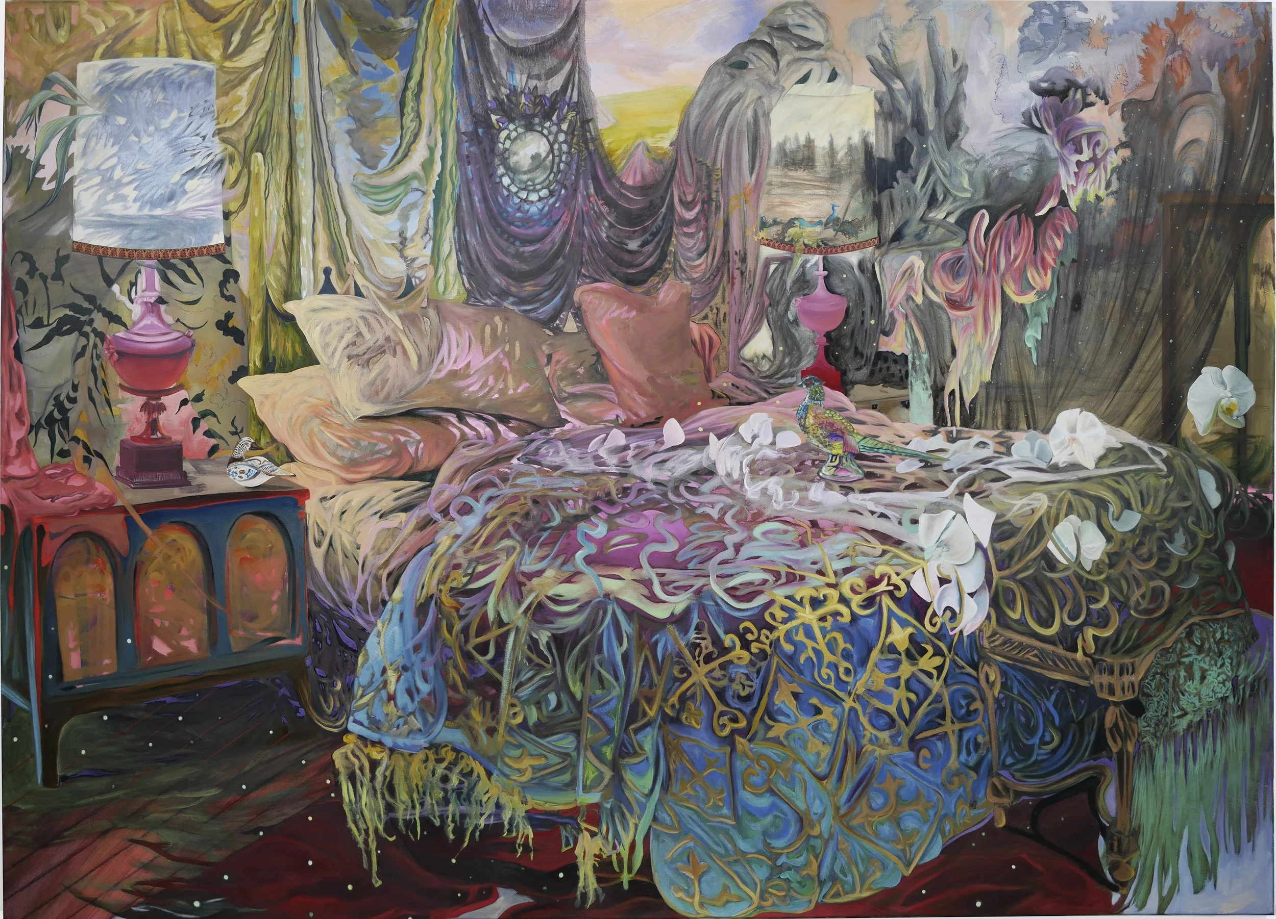 Underlying the canvases in The American Home is the artist’s abiding need to find acceptance: the empty bed in Husband and Husband hints as the erasure of the queer experience from mainstream media and culture yet remains hopeful for a new era of equal rights. Pink Sombrero is a celebratory nod to the artist’s Mexican heritage and shows a shirtless man wearing a large pink sombrero. This painting plays with ideas of machismo Latin American culture, while its ornately shaped structure reminds that identities are often multivalent and complex, where indigenous and European culture coalesce. Indeed, Carrillo Azevedo is a paradigm of intersectionality: not accepted by either white or Mexican culture for his queerness. Indeed, his mother’s deracination of his Mexican ethnicity (as a child he was told he was Italian) led to many years of trauma and confusion about his identity. Like other LGBTQ+ youths in the US, the artist struggled to find a safe and supportive home. His paintings reimagine domestic spaces where harmony and love prevail.